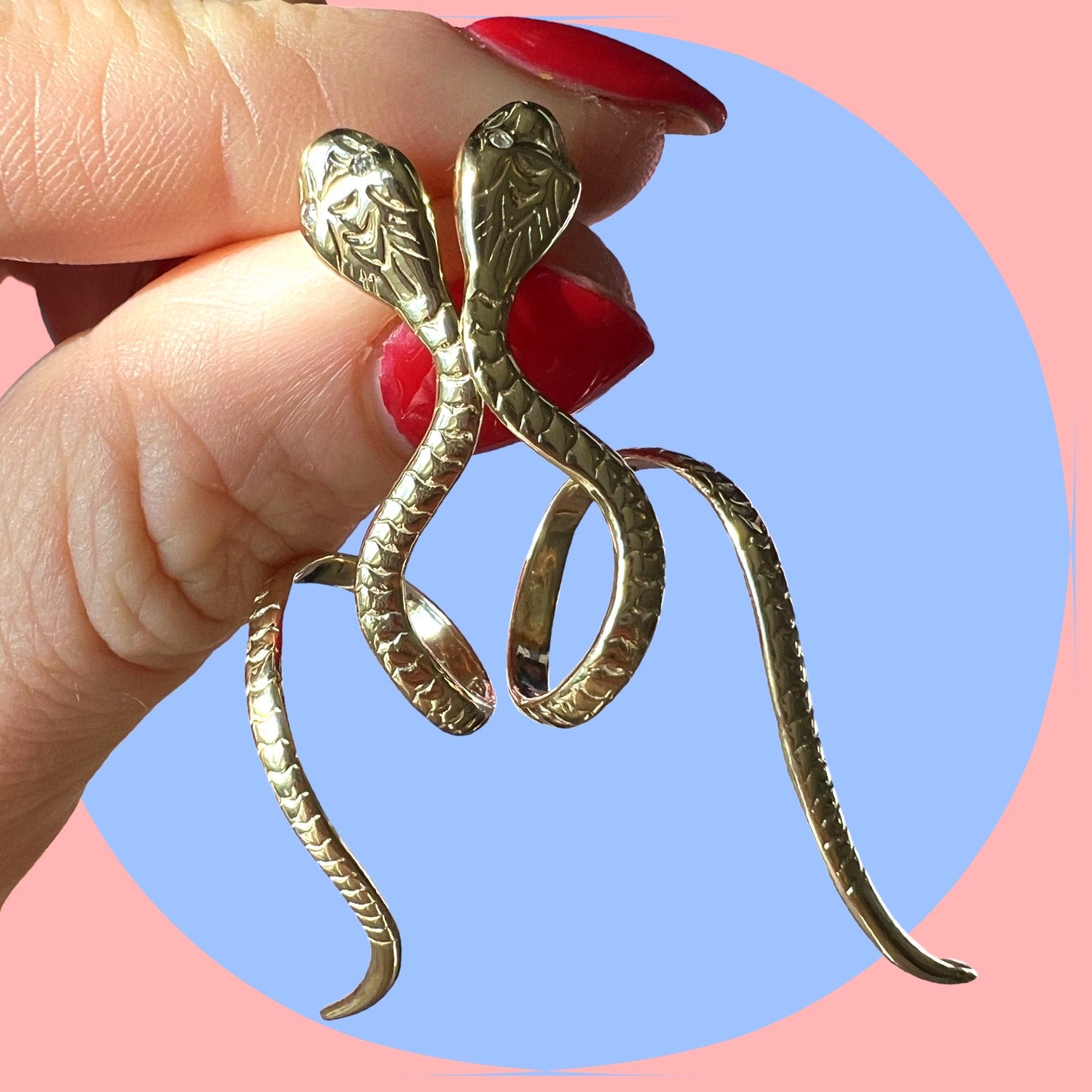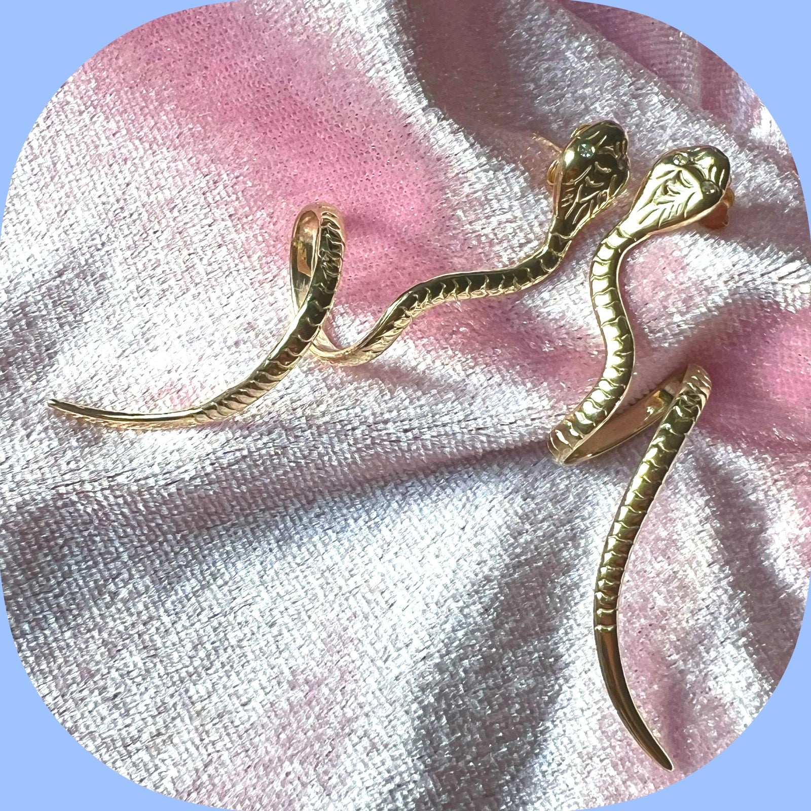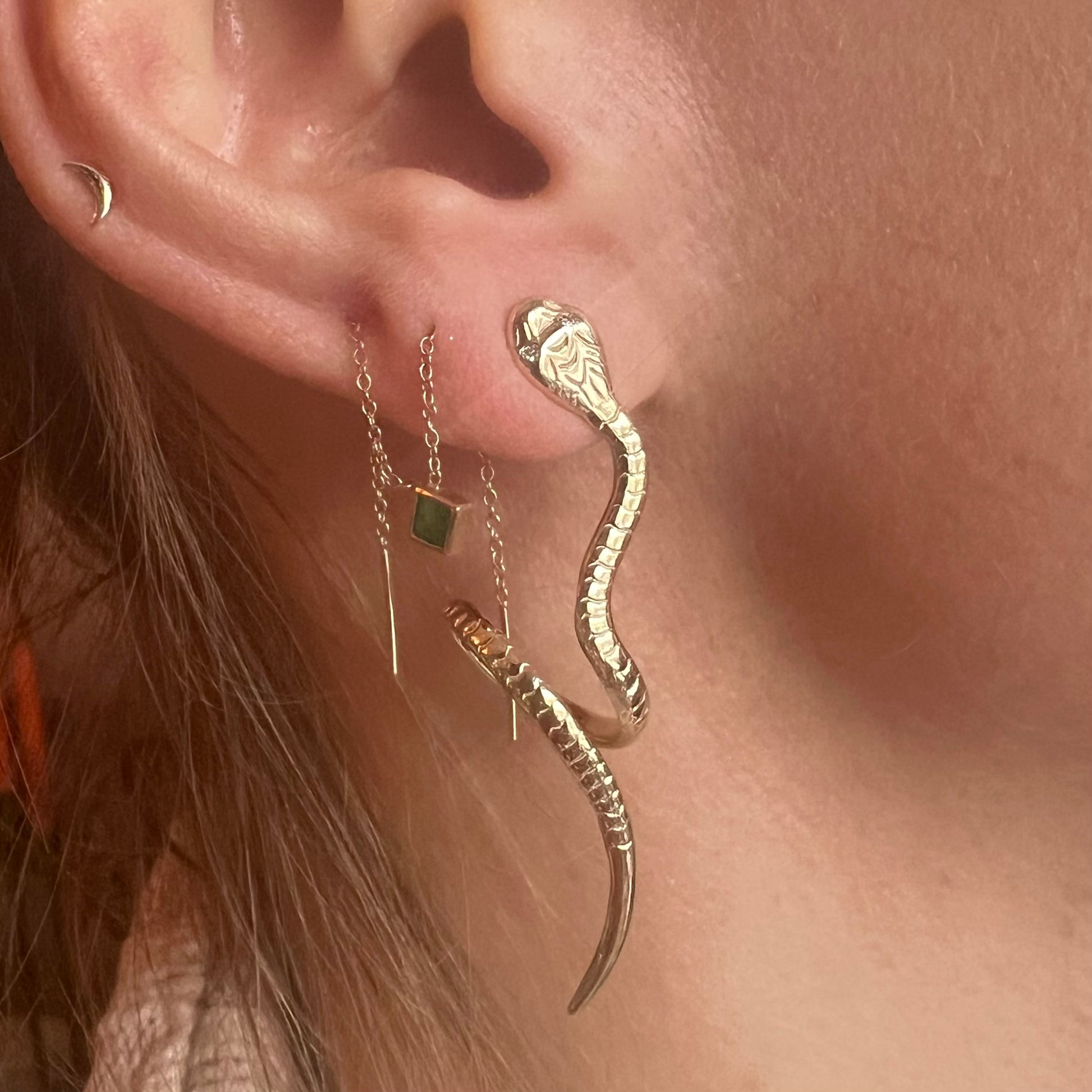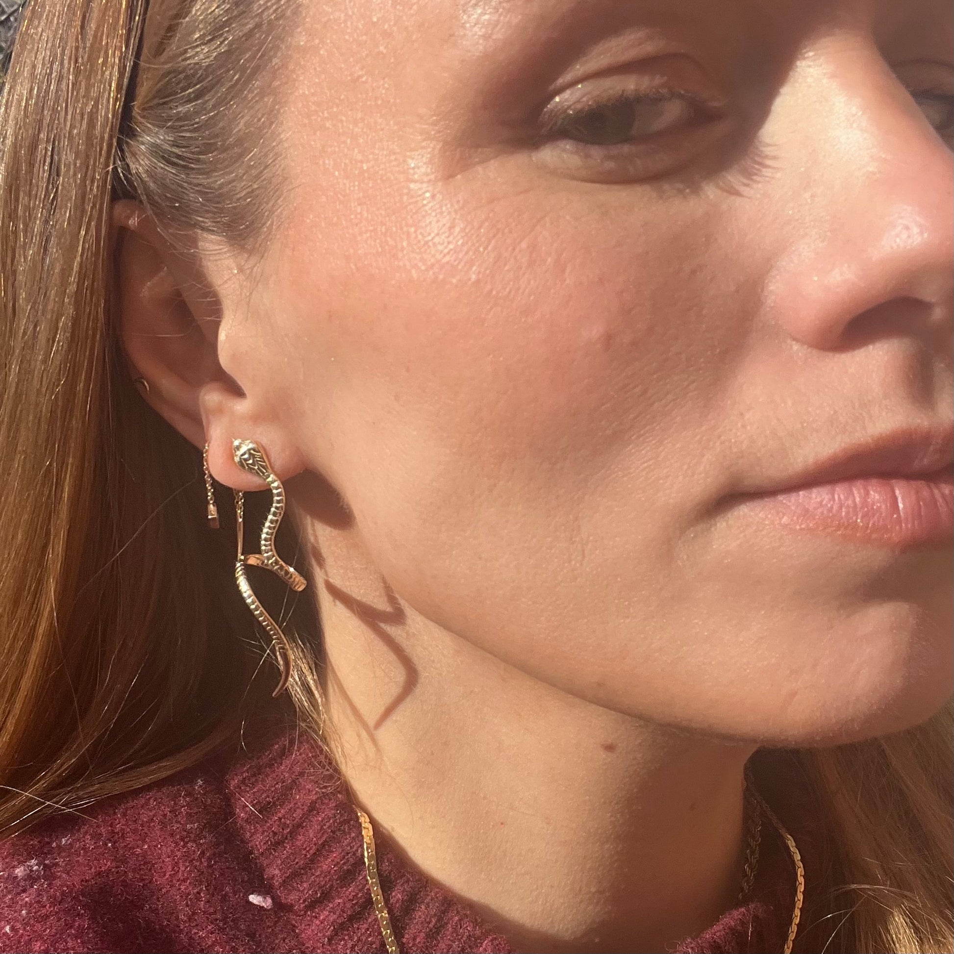I found the MOST PERFECT pair of vintage sterling silver snake earrings at a vintage fair... I scooped them up and knew in MY HEART... that they needed to be recreated in recycled gold. ET VOILA! Cast in recycled 10k gold (to keep the $$ down) with diamonds from a broken bracelet in the peepers!