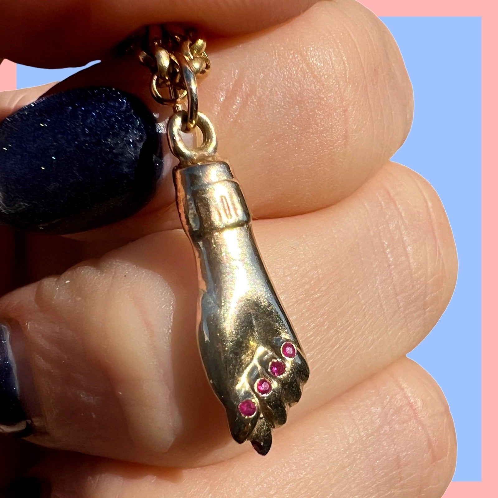 I made a mold of a vintage figa and had it cast in recycled 10k gold, with rubies put in the finger nails! I wanted a modern spin on what I believe to be an early feminist symbol. This beauty invokes the GODDESS. She is a symbol of femininity, life and badassery. She fights of the eye evil, bestows strength, power and positivity...and all what rocking a fresh mani!